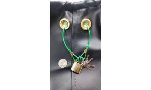 Add Security Grommets, Cable Lock. This consists of several items. First, this accessory must be installed when the tire cover is manufactured. Two grommets are installed, one on each side of the sideband split at the bottom of the cover. These are typical of the same size grommets you see in any tarp. Our cable is stranded steel about eight inches long with a loop on each end. The cable is inserted through both grommets, the loops are pulled together, and a small padlock secures the cable. This security aims to stop any attempt on a snatch and grab by a thief. This system will not protect you if someone really wants to steal your tire cover, but our customers have requested it, so we have provided this accessory for then who think they need it.