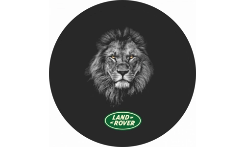 This Tire Cover shows the image of a Lion in the center with the Land Rover Logo on the bottom of a black tire cover.