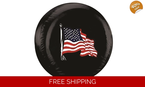 This tire cover features a wavy American Flag printed on black marine-grade vinyl.